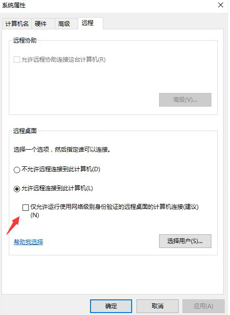 4. 调整远程桌面选项:切换到 “远程” 标签页,在 “远程桌面” 配置区域,取消勾选 “仅允许运行使用网络级别身份验证的远程桌面的计算机连接(建议)” 选项,同时确认 “允许远程连接到此计算机” 选项已勾选。